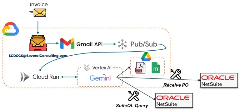 We utilize the process-email function (described above) for initial email content gathering and basic filtering (based on keywords, sender, etc.). This function can then invoke subsequent functions to apply more complex processing using Gemini in Vertex AI.