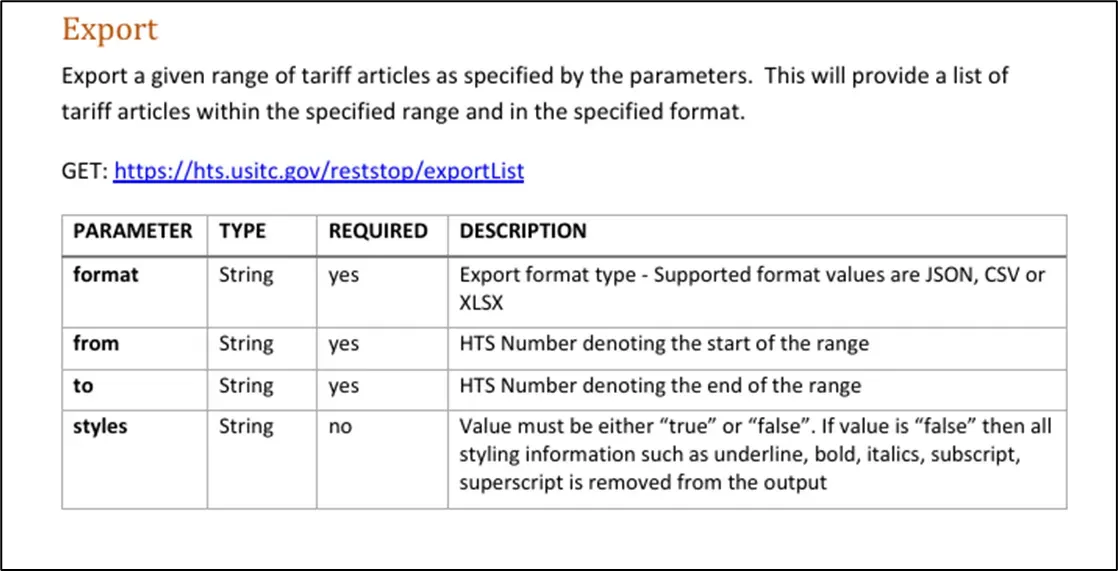 The hts.usitc.gov website provides an option to download the full classification schedule in structured JSON format.