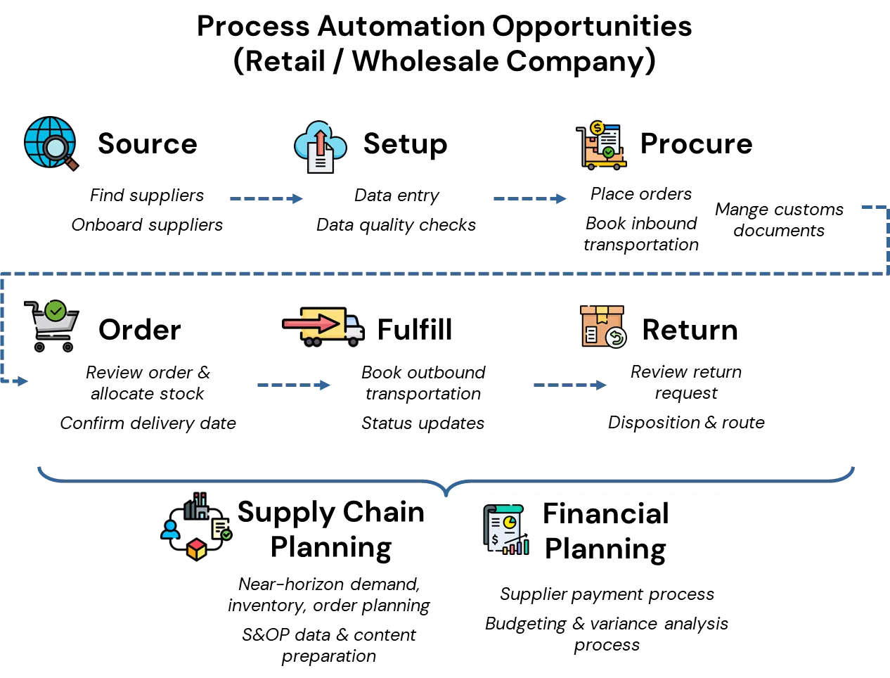 Finally, one note on physical supply chain processes: everyone has seen the Amazon robots, but that is a larger, more complex project. However, there is a sweet spot with cameras and computer vision, where physical processes like counting inventory, monitoring production, etc. can be automated with a relatively lower barrier to entry.